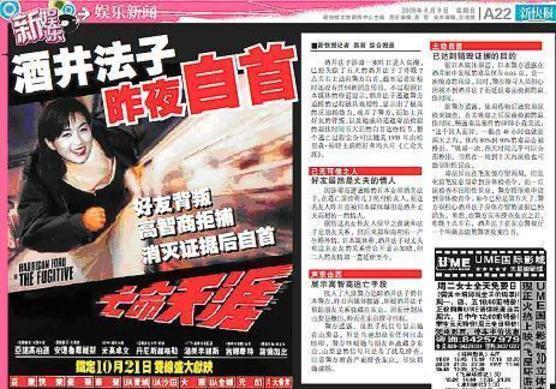 ◇中国/逃亡者、酒井法子自首(中国語)